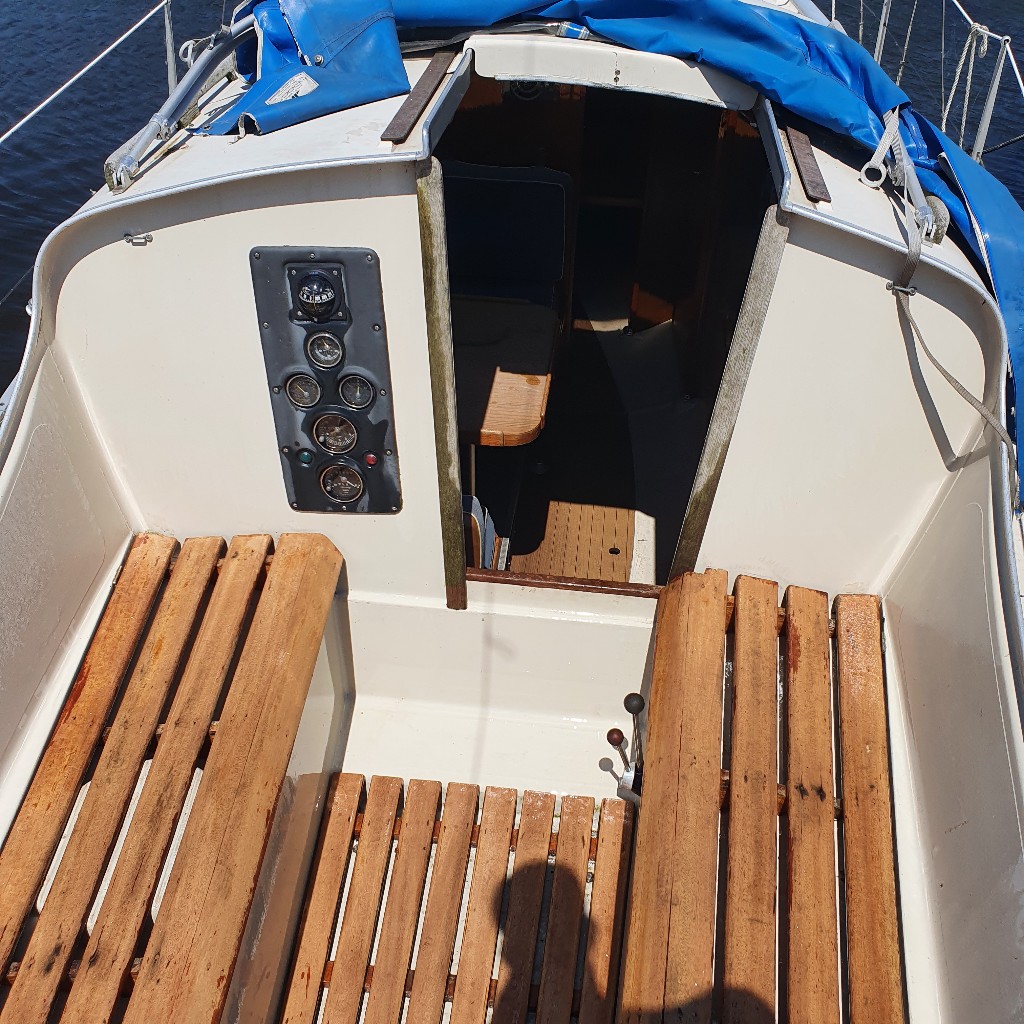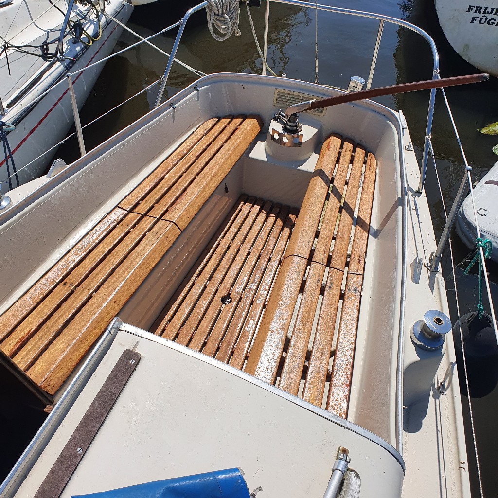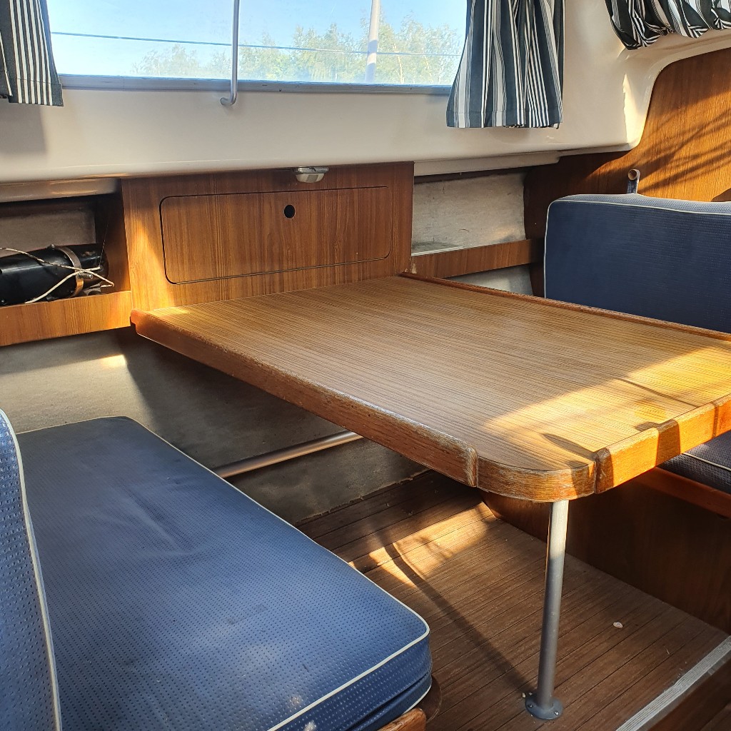 Deze optima heeft door zijn ingenieuze roerconstructie de mogelijkheid om buiten met de helmstok te manouvreren en bij slecht weer binnen met stuurwiel. Indeling kajuit: Bij binnenkomst in deze zeer riante kajuit voor zijn grootte, vindt u aan bakboordzijde een kitchenette met gootsteen en kookgelegenheid. Tevens aan bakboordzijde treft u een dinette met dwars-gesitueerde banken. Aan stuurboordzijde is aan onder de kuipbanken een hondenkooi gemaakt en een stuurstand voor binnenbesturing.