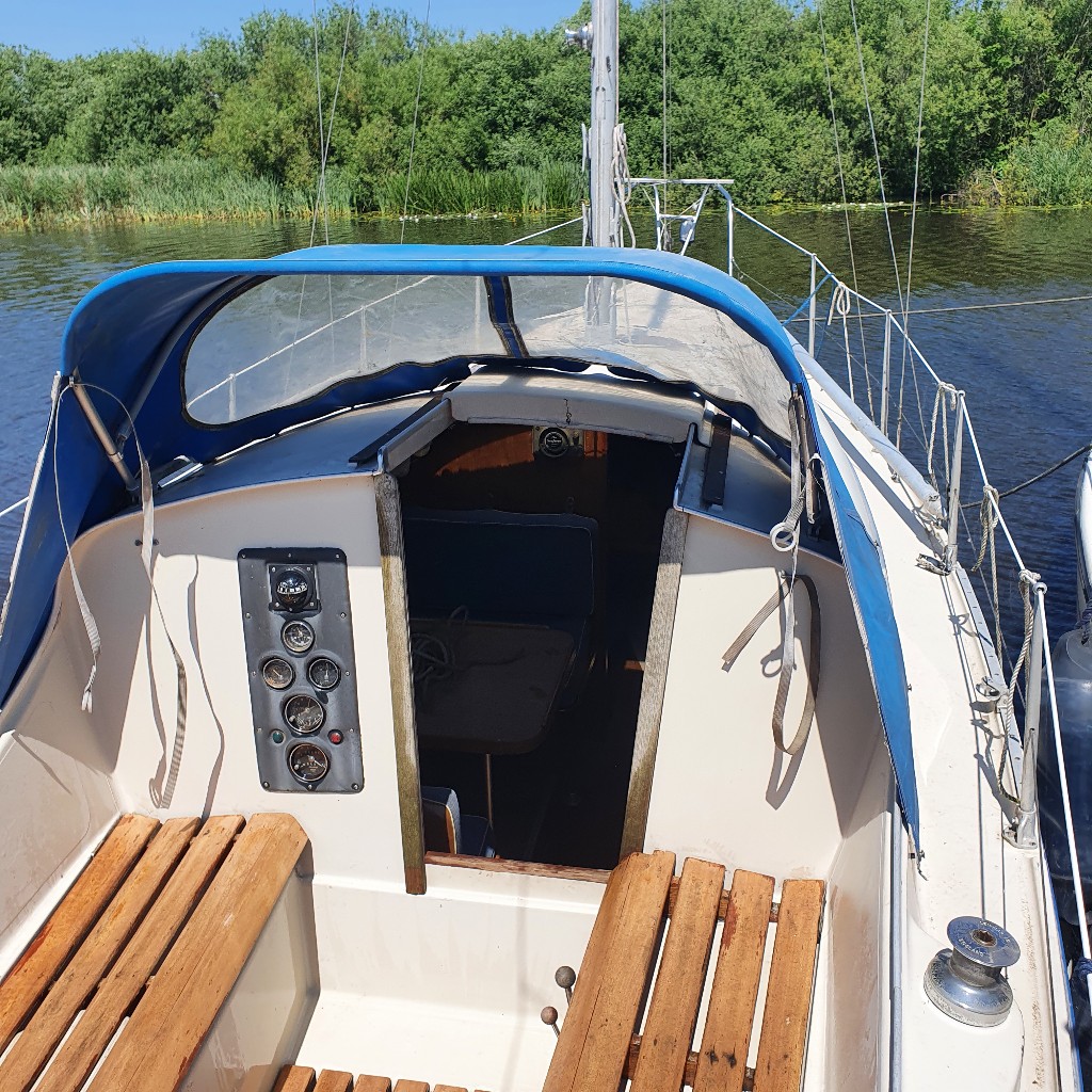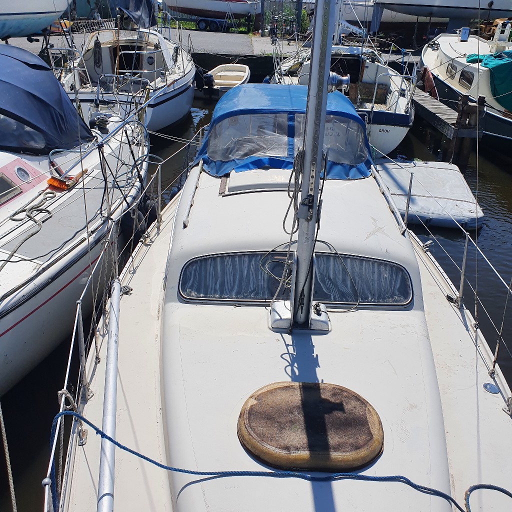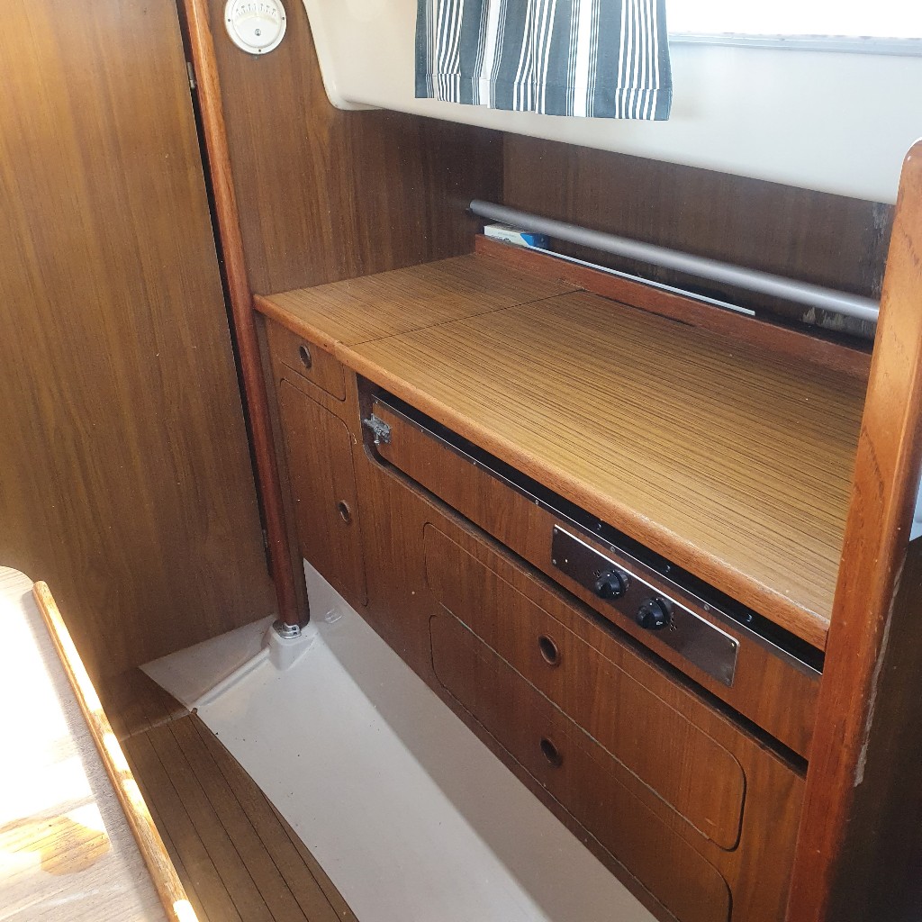 Deze optima heeft door zijn ingenieuze roerconstructie de mogelijkheid om buiten met de helmstok te manouvreren en bij slecht weer binnen met stuurwiel. Indeling kajuit: Bij binnenkomst in deze zeer riante kajuit voor zijn grootte, vindt u aan bakboordzijde een kitchenette met gootsteen en kookgelegenheid. Tevens aan bakboordzijde treft u een dinette met dwars-gesitueerde banken. Aan stuurboordzijde is aan onder de kuipbanken een hondenkooi gemaakt en een stuurstand voor binnenbesturing.